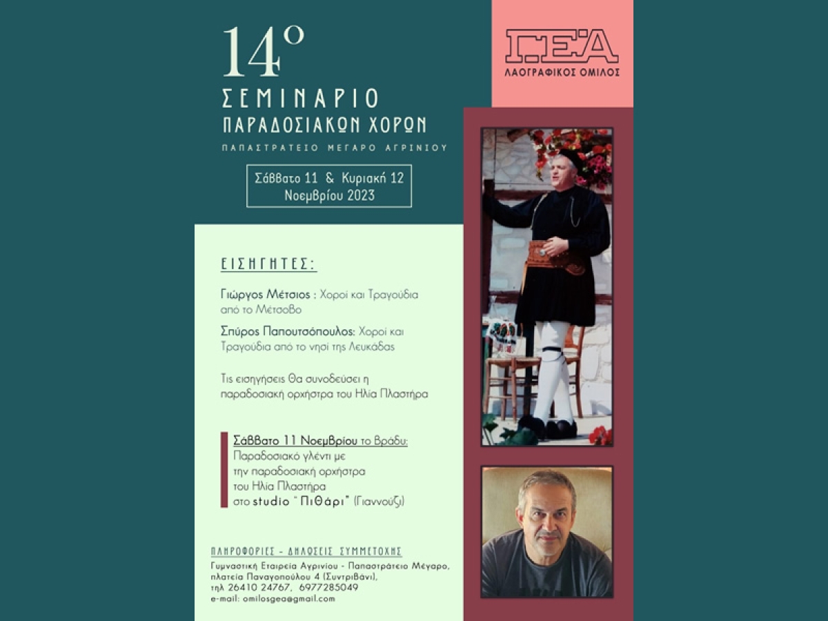 Ο Λαογραφικός Όμιλος της Γυμναστικής Εταιρείας Αγρινίου (ΓΕΑ), συνεχίζοντας μια παράδοση δεκατριών ετών, διοργανώνει φέτος το 14ο σεμινάριο παραδοσιακών χορών το Σάββατο και Κυριακή 11-12 Νοεμβρίου 2023 στο Παπαστράτειο Μέγαρο Αγρινίου.