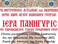 Tην Παρασκευή 29 Αυγούστου 2025 εορτή της Αποτομής της Τιμίας Κεφαλής του Αγίου Ενδόξου Προφήτου Προδρόμου και Βαπτιστού Ιωάννου, εορτάζει το Ιερό του Παρεκκλήσιο στη Γουριά κατά το ακόλουθο πρόγραμμα: ΠΕΜΠΤΗ 28 ΑΥΓΟΥΣΤΟΥ – 8:00 μ.μ.: Μέγας Πανηγυρικός Εσπερινός μετ’ αρτοκλασίας και θείου…