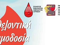 Ο Σύλλογος Εθελοντών Αιμοδοτών Αγρινίου με το Γενικό Νοσοκομείο Αγρινίου (Τμήμα Αιμοδοσίας) συνδιοργανώνουν Εθελοντική αιμοδοσία Την Κυριακή 14 Ιανουαρίου 2024 από τις 10.00 το πρωί μέχρι 2.00 το μεσημέρι στον Ιερό Ναό Αγίας Τριάδας Παναιτωλίου. Η αιμοδοσία θα γίνει με την υποστήριξη Συλλόγων &… περισσότερα...