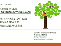 Εκδήλωση θα πραγματοποιηθεί από τη 2η ΤΟΜΥ Αγρινίου-Γαβαλούς σε συνεργασία με το ΠΙ Μεσάριστας, το Π.Π.Ι. Γαβαλούς και την Κοινότητα Μεσάριστας στην πλατεία της Μεσάριστας την Τρίτη 19 Αυγούστου και ώρα 8.30 μμ. Τίτλος της “Μέτρα προστασίας κατά τη χρήση των φυτοφαρμάκων. Η εκδήλωση αφορά το γενικό…